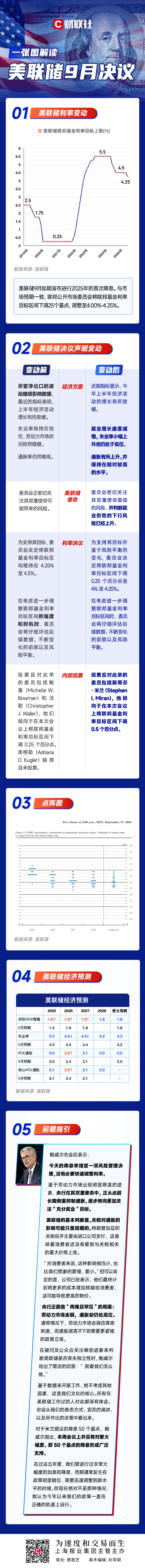 当地时间9月17日,美联储最新的联邦公开市场委员会(FOMC)货币政策会议纪要显示,美联储决定将联邦基金利率目标区间下调25个基点,至4.00%-4.25%之间。这是美联储自2024年12月以来的首次降息。