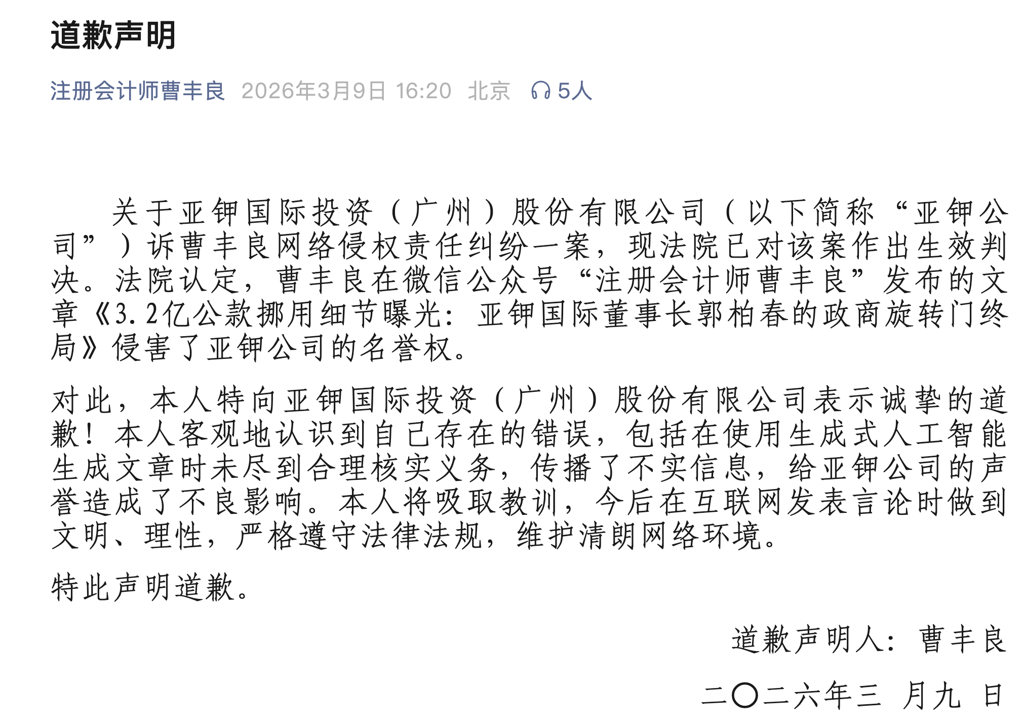 封面新闻记者注意到,该案判决后,被告曹某于2026年3月9日在其个人公众号公开发了《道歉声明》。声明称:“本人特向亚钾国际投资(广州)股份有限公司表示诚挚的道歉!本人客观地认识到自己存在的错误,包括在使用生成式人工智能生成文章时未尽到合理核实义务,传播了不实信息,给亚钾公司的声誉造成了不良影响。本人将吸取教训,今后在互联网发表言论时做到文明、理性,严格遵守法律法规,维护清朗网络环境。”
